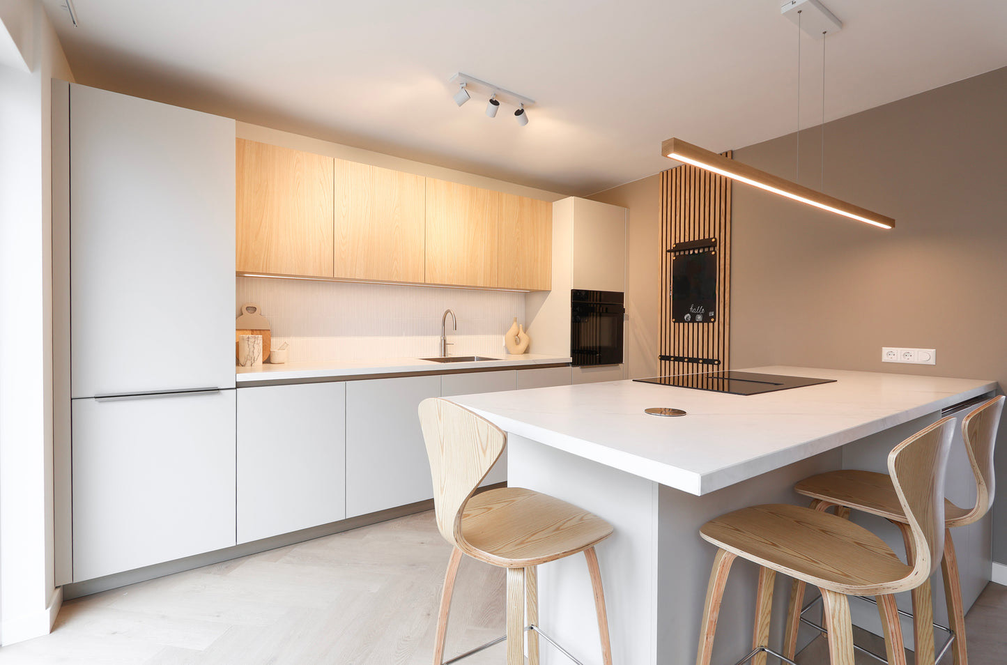 In dit project creëerde MORSS Kitchen & Interior een lichte, moderne keuken waarin rust, functionaliteit en stijl samenkomen. De combinatie van matte fronten in een zachte tint en warme eiken bovenkasten zorgt voor een serene en natuurlijke uitstraling. Het geheel voelt luchtig en ruimtelijk aan, mede dankzij het rustige lijnenspel en de greeploze afwerking.